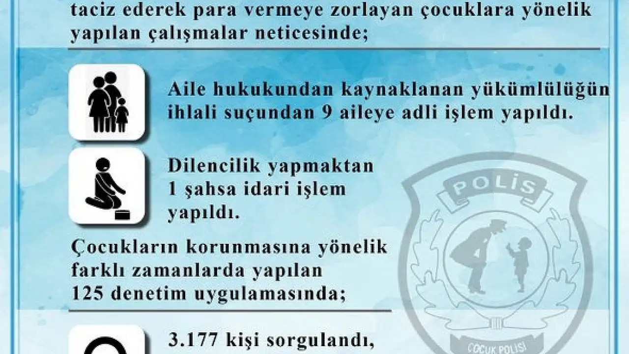 Çocuk Şube Müdürlüğü ekiplerince satıcılık ve dilencilik yapan yayaları ve sürücüleri taciz ederek para vermeye zorlayan çocuklara yönelik yapılan çalışmalar neticesinde; Aile hukukundan kaynaklanan yükümlülüğün ihlali suçundan 9 aileye adli işlem yapıldı. Dilencilik yapmaktan 1 şahsa idari işlem yapılırken çocukların korunmasına yönelik farklı zamanlarda yapılan 125 denetim uygulamasında; 3 bin 177 kişi sorgulandı, aranması olan 9 şahıs yakalandı. Öte yandan 468'si internet ve PlayStation salonu olmak üzere 981 umuma açık iş yeri, park-bahçe ve metruk bina kontrol edildi.