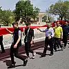 Hacılar mezarlık üzerinde toplanan kalabalık, Hisarcık Caddesi’nden Cumhuriyet Meydanı’na yürürken, Başkan Büyükkılıç, yürüyüş sırasında gençlerle birlikte dev Türk bayrağını taşıdı.