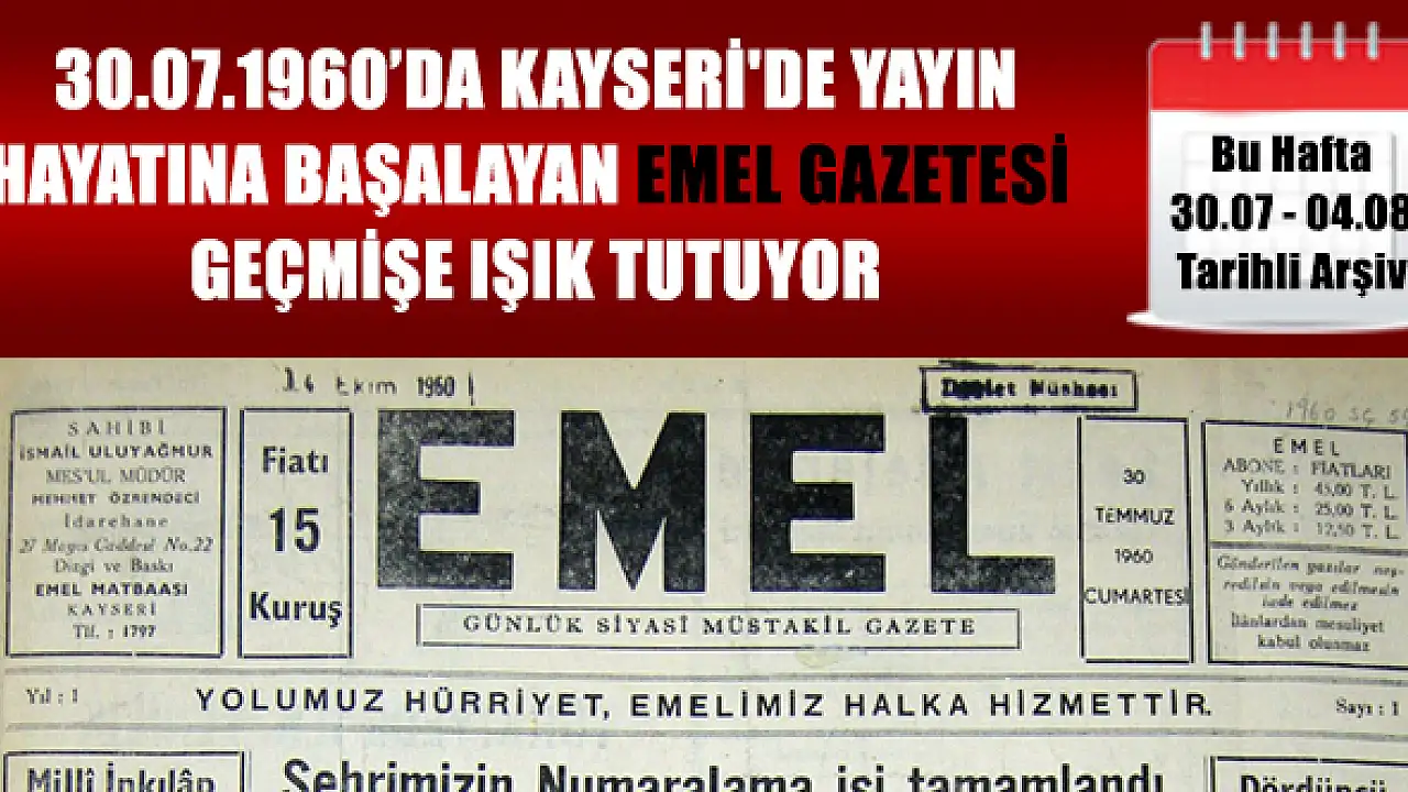 İnternetin yaygınlaşmasıyla her geçen gün piyasada değer kaybı yaşayan gazetelerimiz maalesef zor durumdalar. Gerçek değeri ile kıyaslanamayacak bir kayıp söz konusu gazetelerimizde. Birçok gazete belediyelerin ve birkaç şirketin desteğiyle ayakta kalmayı başarabiliyorlar ama zorla ama birilerine muhtaç olarak. Hiçbir zaman unutulmaması gereken bir söz vardır “Akıl unutur, Kalem unutmaz.” Bu güne kadar gerek ülke genelinde gerek şehirler bazında birçok gazete ve yayın organı açılıp kapanmıştır. Birçoğunu beki hatırlamayız ama hem devlet arşivleri hem de özel arşivler bu anda yardımımıza koşar. Uzun bir araştırma sürecinden sonra elde ettiğimiz 30 Temmuz 1960 tarihinde Kayseri’de yayın hayatına başlayan Emel Gazetesi’de bu söze en büyük örneklerden. Kuruculuğunu ve uzun yıllar Genel Yayın Yönetmenliğini yapan İsmail ULUYAĞMUR’un “Benim çocuklarımdan farksız” dediği Emel Gazetesi o günlerin bugünümüze taşınmasında en güzel ve kalıcı örnektir. Haftalık yayın dizisi şeklinde yayınlayacağımız gazete sayfalarında o dönemi yaşayan takipçilerimiz belki kendini bulacak ve o tarihlerden sonra akıl baliğ olanlarda o günleri öğrenmiş olacak.