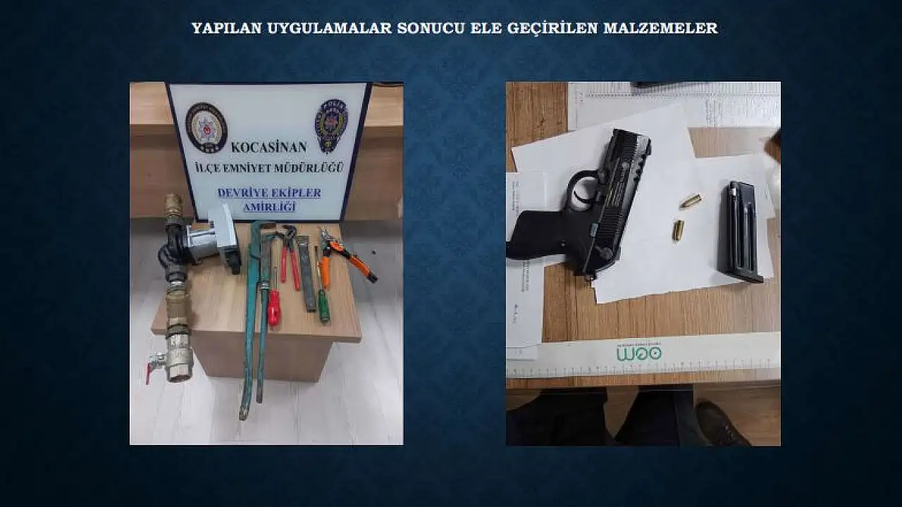 Ayrıca 15 hırsızlık şüphelisi de adli makamlara sevk edilirken, 8 hacizli yakalamalı ve 5 çalıntı oto bulundu. 9 şahsa Kabahatler Kanununa muhalefet etmekten işlem yapıldı. 3 ruhsatsız tabanca, 1 av tüfeği ve 71,7 gram uyuşturucu metamfetamin maddesi ele geçirildi.