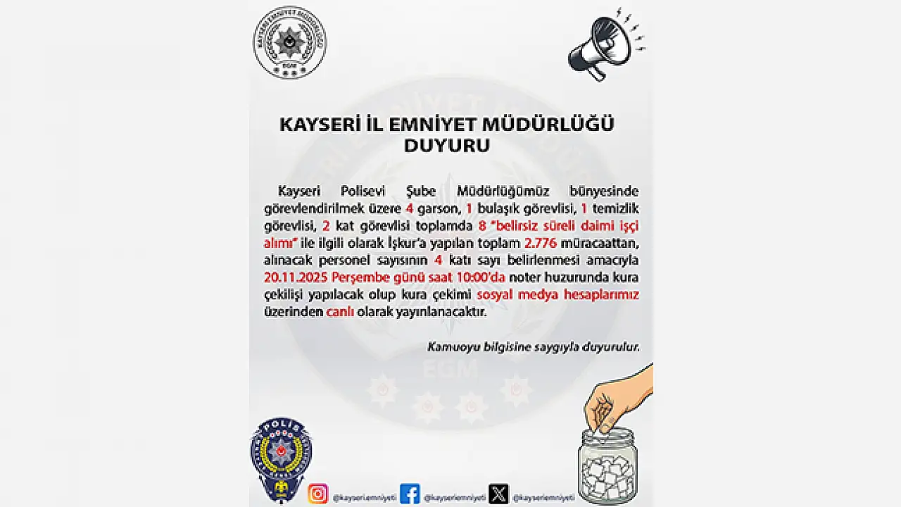 20 Kasım 2025 Perşembe günü saat 10.00’da, noter huzurunda yapılacak kura çekilişi, Emniyet Müdürlüğü’nün sosyal medya hesaplarından canlı olarak yayınlanacak. Kura yöntemi, başvuruların yoğunluğu nedeniyle zorunlu hale gelirken, tablo aynı zamanda Kayseri’deki iş arayan nüfusun büyüklüğüne dair vahim bir gösterge sunuyor.