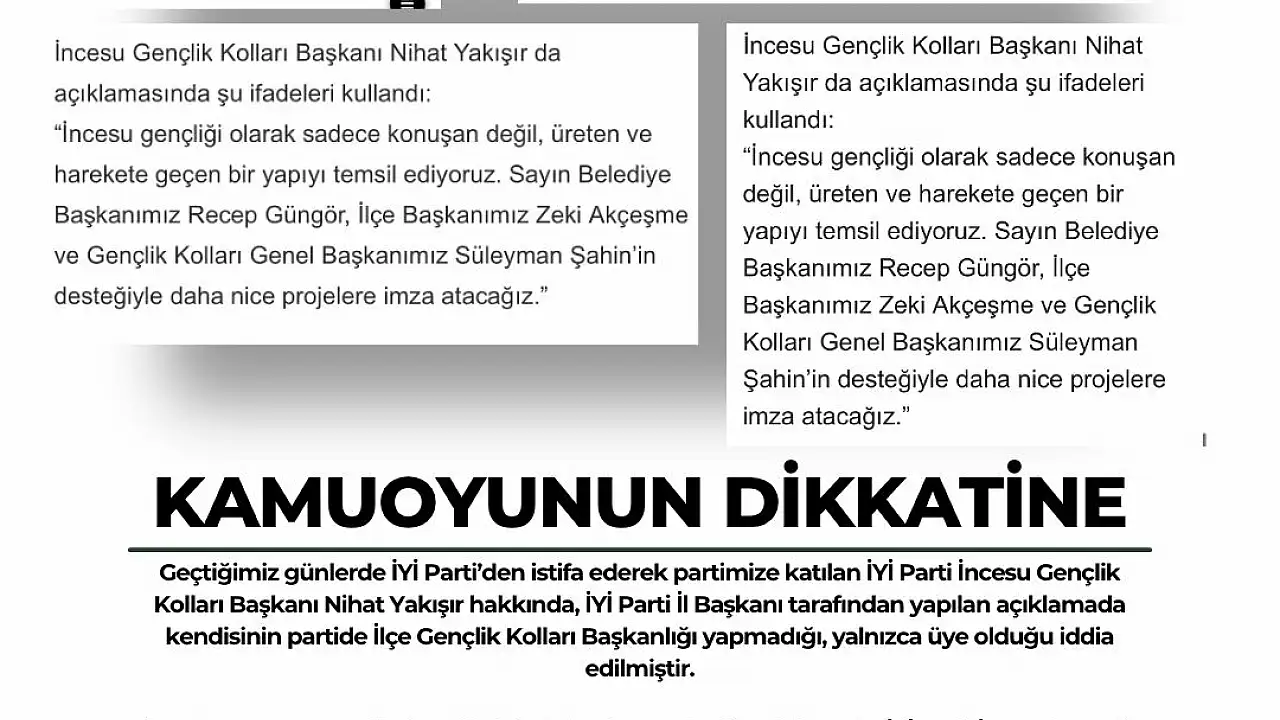 AK Parti Kayseri İl Başkanlığı ise Haziran 2025 tarihli haberleri göstererek, Nihat Yakışır’ın İYİ Parti İncesu Gençlik Kolları Başkanı olarak görev yaptığını ortaya koydu. Söz konusu haberlerin, dönemin İYİ Parti yetkilileri tarafından basına servis edildiği belirtildi.