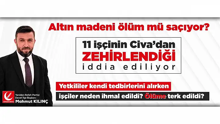 Yeniden Refah Partisi Develi İlçe Başkanı Mahmut Kılınç 'Bazı haberlerde ve bize gelen bilgilerde altın maden ocağında Ocak ayında test yapıldığı ve yapılan test sonucunda yüksek miktarda civa tesbit edildiği, civa tesbit edilmesine rağmen insan sağlığı hiçe sayılarak çalışmalara devam edildiği ve aylarca civa olayının devlettende gizlendiği altın madeninde çalışan 11 işçininde vücudunda civa tesbit edildiği ve bu işçilerin civadan zehirlendiği iddia edilmiştir. Bu iş direk olarak adam öldürmeye teşebbüsdür, adli merciler gereğini yapmalıdır.