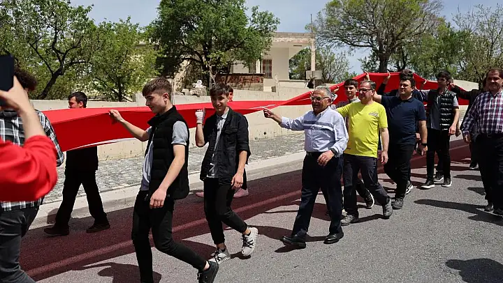 Hacılar mezarlık üzerinde toplanan kalabalık, Hisarcık Caddesi'nden Cumhuriyet Meydanı'na yürürken, Başkan Büyükkılıç, yürüyüş sırasında gençlerle birlikte dev Türk bayrağını taşıdı.