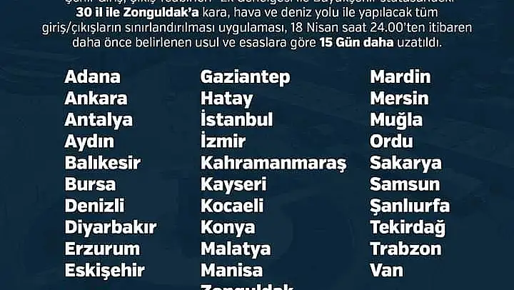 1) İlimiz genelinde giriş ve çıkış sınırlaması/yasaklamasının 18 Nisan 2020 Cumartesi günü saat 24.00'den itibaren 15 günlük süre için geçici olarak durdurulmasının devam ettirilmesine 5442 sayılı İl İdaresi Kanunun 11/C maddesi gereğince karar verilmiştir.