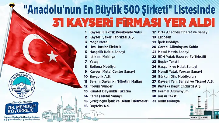 Kayseri Büyükşehir Belediye Başkanı Dr. Memduh Büyükkılıç, 'Anadolu'nun En Büyük 500 Şirketi Listesi'nde yer alan 31 Kayseri firmasını tebrik etti. Büyükkılıç, 'Ülkemizin üretime önemli bir katkı sunan, şehrimizin gururu firmalarımızı kutluyor, üretim ve istihdam yolunda başarılarının devamını diliyorum' dedi.