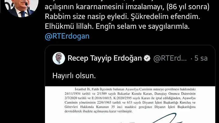 'Danıştayın 10.Dairesi, Ayasofya'nın camiden müzeye dönüştürülmesine dair 24 Kasım 1934 tarihli Bakanlar Kurulu kararını iptali üzerine kararnameyi imzalayan Cumhurbaşkanımız, ilk namazın 24 Temmuz 2020 Cuma günü kılınacağının müjdesini verdi.