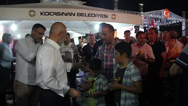 Kocasinan Belediye başkanı Ahmet Çolakbayrakdar, stantta vatandaşlara dondurma ve tatlı dağıtımı yaptı. Çolakbayrakdar birlik ve beraberliğimizin daim olması dileğinde bulunarak, 'Tabiki bu önemli bir şey, vatandaş nasıl 15 Temmuz 2016'da milli ve manevi değerlerine, vatanına sahip çıkmak adına duruş sergiledi. Bugün ki bu kalabalıkta, Allah göstermesin böyle bir durum olursa biz böyle bir duruş sergileriz göstergesidir. Ben bütün hemşerilerimize hayırlı sıhhatler diliyorum. Bu durum artık gelenekselleşti. 15 Temmuz'un ilk gecesi Kocasinan Belediyesi ilk defa su dağıtarak başlamıştık. Yani elimizde suyumuz, meyve suyumuz vardı. Sabah saatlerinde simit gibi yiyeceklerle başlamıştık. Çünkü gecenin bir vakti ve vatandaş burada kalabalık şekilde bekliyordu. Tabi ki bu ürünler artık gelenekselleşti ama bugünde dediğimiz gibi geleneksel bir şekilde yerimizde devam ediyoruz' dedi.