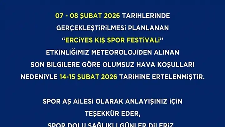 Açıklamada ayrıca, Erciyes Kış Spor Festivali'nin 14-15 Şubat 2026 tarihlerinde yapılmasının planlandığı bildirildi. Festivalin yeni tarihinde, kış sporları ve çeşitli etkinliklerle ziyaretçilere keyifli anlar yaşatması hedefleniyor.