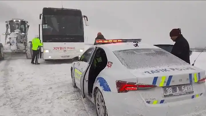 Kayseri'de yoğun tipi nedeniyle Erciyes yolu üzerinde hareket kabiliyetini kaybeden tur otobüsünde bulunan 44 vatandaş, polis ekiplerince kurtarıldı.