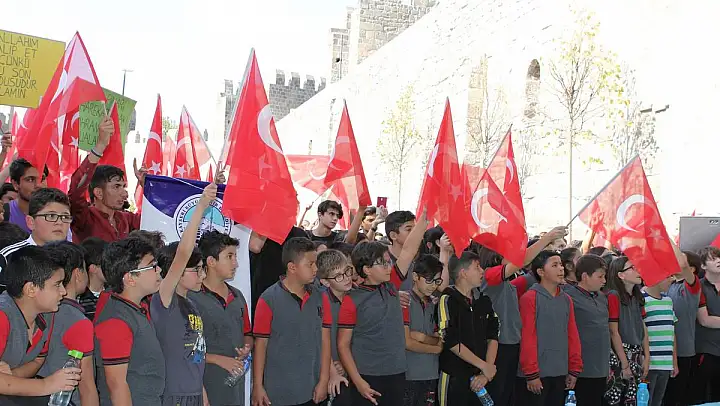Kartal Şehitliği'nden Kayseri Kalesi Kültür ve Sanat Merkezi'ne Türk bayrakları ve sloganlarla yürüyen gençler burada Refika Küçükçalık İlköğretim Okulu öğrencileri ile buluştu. Öğrenciler hep birlikte komando marşını okudu. Öğrenciler tarafından yapılan duaların ardından Barış Pınarı Harekatı'na anlamlı bir destek daha geldi. Kale içinde yer alan Genç KAYMEK standına geçen öğrenciler 'Gönülden Mehmetçiğe' adlı deftere mektuplar ve mesajlar yazdılar. Mesajlarda; 'Ben de büyüyünce asker olacağım', 'İnşallah sağ salim dönersiniz', 'Allah yardımcınız olsun', 'İyi ki varsınız' gibi ifadeler yer aldı. 'Gönülden Mehmetçiğe' adıyla açılan defterler Barış Pınarı Harekatı'ndaki askerlerimize gönderilecek.