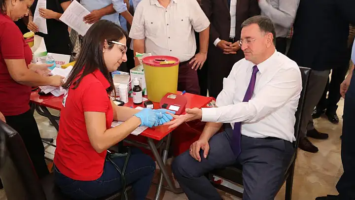 Hatay Büyükşehir Belediyesi Meslek Edindirme Kursları(HATMEK) Salonu'nda 'Kan Ver Kahraman Ol, Bu Güce Sen de Destek Ol' sloganı altında başlatılan kampanyaya Hatay Büyükşehir Belediye Başkanı Doç. Dr. Lütfü Savaş, HATSU Genel Müdürü Mehmet Çaparali, Büyükşehir Belediyesi Genel Sekreteri Nihat Tazearslan, Daire Başkanları, şube müdürleri ve personeller katılım göstererek ordumuz için kan bağışında bulundu.