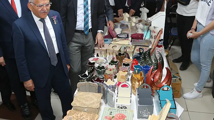 Kayseri Büyükşehir Belediye Başkanı Dr.Memduh Büyükkılıç, Büyükşehir Belediyesi'nin mesleki eğitimdeki markası KAYMEK, Kayseri İl Sağlık Müdürlüğü ve Kayseri İl Milli Eğitim Müdürlüğü iş birliği ile gerçekleştirilen Toplum İş Sağlığı İş Uğraş Terapi Sergi
