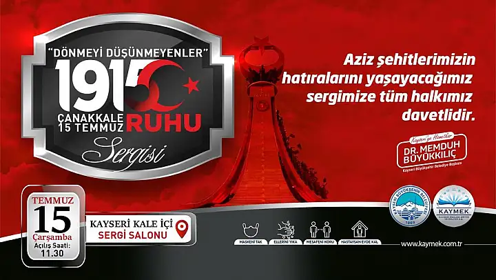 Kültürel ve manevi zenginlikleri yaşatmak ve gelecek nesillere aktarmak için KAYMEK'in düzenlediği 'Dönmeyi Düşünmeyenler 1915 Çanakkale – 15 Temmuz Ruhu'' sergisi KAYMEK eğitmenleri tarafından yüzde 80 oranında atık madde kullanılarak 45 günde tamamlandı. 18 Mart 2020 tarihinde ''18 Mart Şehitleri Anma Günü ve Çanakkale Zaferi'' etkinlikleri kapsamında yapılması planlanan ''Çanakkale Destanı'' isimli sergi Covid-19 nedeniyle ertelenmişti. 15 Temmuz Demokrasi ve Milli Birlik Günü dolayısıyla sergi yeniden düzenlenerek yeni normal süreçte ''Dönmeyi Düşünmeyenler 1915 Çanakkale – 15 Temmuz Ruhu'' adıyla ziyarete açılıyor. Kayseri Büyükşehir Belediyesi KAYMEK A.Ş. tarafından hazırlanan ''Dönmeyi Düşünmeyenler 1915 Çanakkale – 15 Temmuz Ruhu'' isimli sergide 15 Temmuz Şehitler anıtının minyatürü, Çanakkale Şehitleri Anıtı, Seyit Onbaşı, Nusret Mayın Gemisi, Kınalı Hasan, Zehirli Çivi ve Çarık, Çocuk Asker, Savaş Kahraman'larının konu edildiği ve hikayeleştirildiği 47 eser 35 eğitmen tarafından Geleneksel Türk El Sanatları teknikleriyle (ebru, çini, filografi, Maraş işi, kumaş boyama, nakış, hüsn-i hat vs.) 3 boyutlu olarak hazırlandı