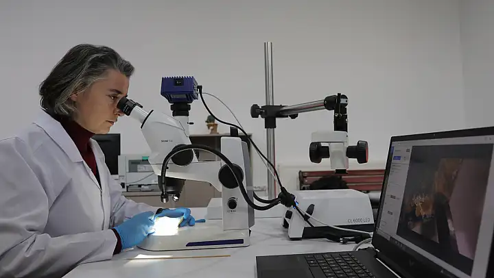 Laboratuvar çalışmaları hakkında bilgi veren Konservasyon Uzmanı Sibel Çetinkaya, koruma ve onarım süreçlerinde teşhisin büyük önem taşıdığını belirterek, 'Ön inceleme, analiz, test ve mikroskobik görüntülerle eserdeki bozulmaları tespit ediyoruz. Buna göre en uygun müdahale yöntemini belirliyoruz' dedi.