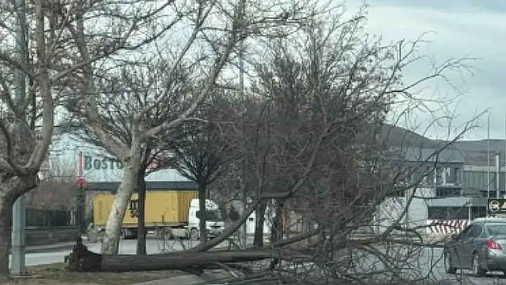 Kayseri'de etkili olan şiddetli rüzgar, Danişmendgazi Mahallesi'nde bir ağacın kökünden sökülmesine yol açtı.