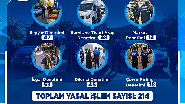 Ay boyunca sürdürülen denetimlerde ekipler; seyyar satıcılar, ticari araçlar, marketler, dilencilik olayları ve çevre kirliliği gibi pek çok alanda etkin rol aldı. Bu kapsamda 47 seyyar satıcı, 38 servis ve ticari araç, 13 market ve 53 işgal denetimi yapıldı. Ayrıca 45 dilencilik vakasına müdahale edilirken, çevre kirliliğine yönelik 18 işlem gerçekleştirildi. Böylece Kasım ayındaki toplam yasal işlem sayısı 214'e ulaştı.
