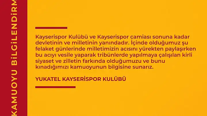 Süper Lig'de daha önce oynanması gereken ancak ertelenen müsabakalar dün ve bugün oynandı. Dün oynanan müsabakanın ardından bugün oynanan bazı karşılaşmalarda hükümet aleyhine tezahüratlar yapıldı. Bu tezahüratların ardından Kayserispor resmi hesaplarından açıklama yapıldı. Yapılan açıklamada, 'Kayserispor'un ve Kayserispor camiasının devletin ve milletin sonuna kadar yanında olduğunu, şu felaket günlerinde milli acımızı yürekten paylaştığını, tribünlere hakim olmaya çalışan kirli siyaset ve zillete de karşı olduğunu ve bunu da kınadığımızı kamuoyunun bilgisine sunarız' ifadelerine yer verildi.