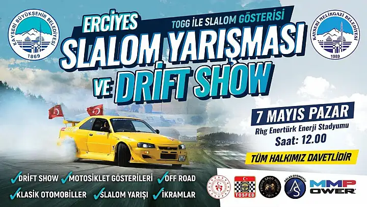 7 Mayıs Pazar günü Rhg Enertürk Enerji Stadyumu'nda saat 12.00'de Erciyes TOGG ile Slalom Gösterisi, Slalom Yarışması ve Drift Show düzenlenecek. Katılımın ücretsiz olacağı etkinlikte drift show, motosiklet gösterileri, off road, klasik otomobiller, slalom yarışı gösterileri vatandaşlara eğlenceli ve heyecan dolu bir gün yaşatacak.