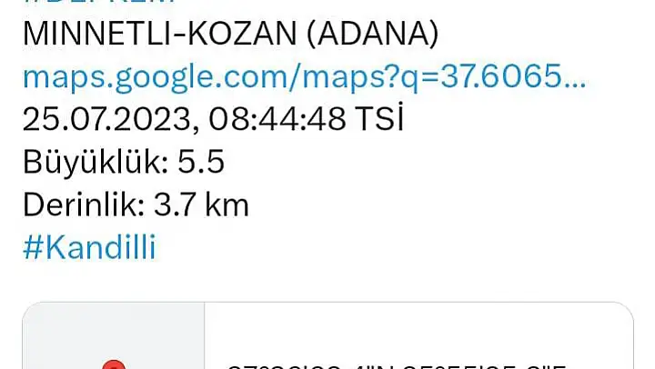 Kandilli Rasathanesi ölçümlerine göre saat 08:44'de Adana Kozan merkezli 5,5 şiddetinde deprem meydana geldi. Yerin 3.7 kilometre derinliğinde yaşanan deprem Kayseri'den de hissedildi. Yüksek katlı binalarda oturanlar sarsıntıyı daha fazla hissetti. İlk belirlemelere göre Kayseri'de hasar ya da can kaybı yok.