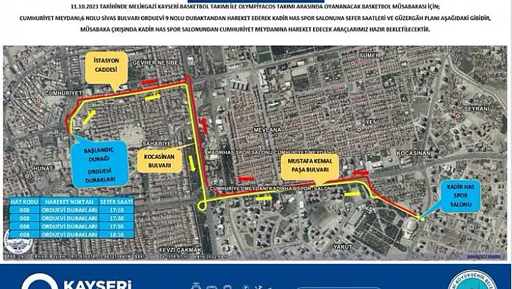 Kayseri Büyükşehir Belediyesi Ulaşım A.Ş. tarafından Melikgazi Kayseri Basketbol ile Olimpiakos arasında yarın Kadir Has Kongre ve Spor Salonu'unda oynanacak Avrupa Kupası maçı için ek sefer düzenlenecek.