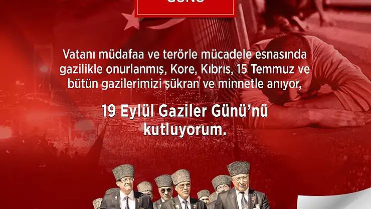 "Ülkemizin sessiz kahramanları olan şehit ve gazileri sevgi, saygı ve şükranla anıyorum. Bizler, ecdadımızdan miras kalan hasletlere sahip çıkmanın, birlik ve beraberliğimize yönelen tehditlere karşı mücadele etmenin, ülkemizi muasır medeniyetler seviyesinin üstüne çıkarmak için çalışmanın, şehitlerimize ve gazilerimize vefa borcumuzun da gereği olduğuna inanıyoruz. Bugün millet olarak, birlik ve beraberlik içinde, bağımsız ve hür yaşıyorsak, bunu aziz şehitlerimize ve kahraman gazilerimize borçluyuz. Bu nedenle, bizlere emanet edilen bağımsız vatan toprakları üzerinde, şehit ve gazilerimizin aziz hatıralarını sonsuza kadar yaşatmak hepimizin ortak sorumluluğudur. Bu kapsamda vatanı müdafaa ve terörle mücadele esnasında gazilikle onurlanmış, Kore, Kıbrıs, 15 Temmuz gazilerimiz ve bütün gazilerimizi şükran ve minnetle anıyor, 19 Eylül Gaziler Günü'nü kutluyorum."