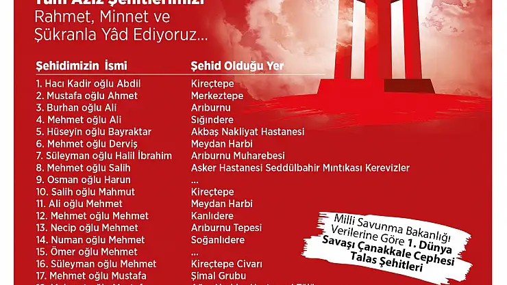 1. Dünya Savaşı Çanakkale cephesinde Talas’ın da çok sayıda şehit verdiğine işaret eden