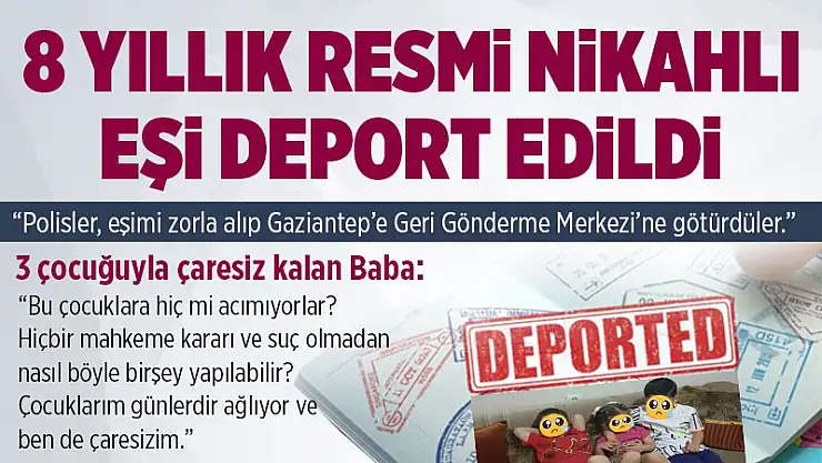 Bingöl’de 8 yıl önce Suriye uyruklu Dua Dönmez ile evlenen ve bu evlilikten 3, 5 ve 7 yaşlarında da 3 çocuğu bulunan Bingöl nüfusuna kayıtlı Hasan Dönmez, eşinin deport edildiğini, çocuklarıyla çaresiz kaldığını ve yetkililerden yardım beklediğini söyledi.