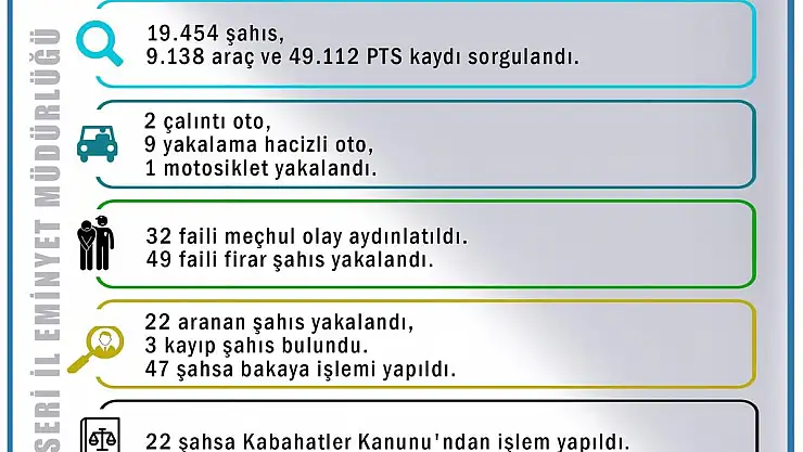 19 bin 454 şahıs, 9 bin 138 araç ve 49 bin 112 PTS kaydı sorgulandı. 2 çalıntı ve 9 yakalama hacizli otomobil, bir de çalıntı motosiklet ele geçirildi. 32 faili meçhul olay aydınlatılırken 49 faili firar şahıs da yakalandı, 3 kayıp şahıs bulunurken 47 şahsa bakaya işlemi yapılmasının yanı sıra 22 de aranan şahıs yakalandı. 22 şahsa Kabahatler Kanunu’ndan işlem yapılırken 3 ruhsatsız tabanca, 2 av tüfeği, 3 kurusıkı tabanca, 58 fişek, 5 bıçak ve 9,46 gram uyuşturucu madde ele geçirildi.