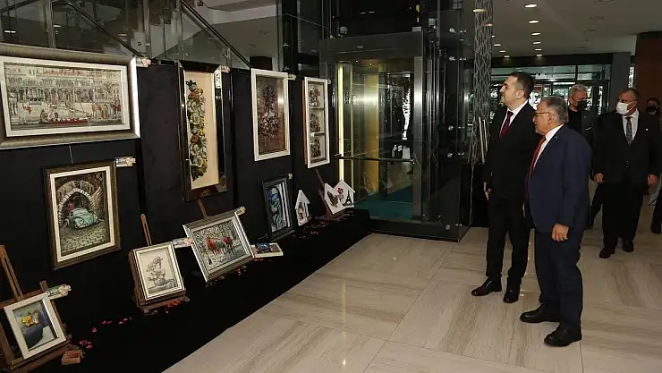 Başkan Büyükkılıç, sergi gezisinde TRT Yönetim Kurulu Başkanı Albayrak’a el emeği bir tablo hediye etti.