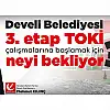 Dar ve orta gelirli ailelerin TOKİ'den başka ev sahibi olma umudu kalmamış, insanlar sürekli bizi arayarak toki çalışmasının ne zaman başlayacağını soruyor, bende sormadan edemiyorum Develi Belediyesi 3.etap TOKİ çalışması için neyi bekliyor?