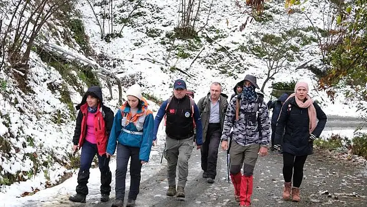 Yoğun kar yağışı altında gerçekleşen yürüyüş, katılımcılara hem sonbaharın hem de mevsimin ilk karının keyfini bir arada yaşattı.