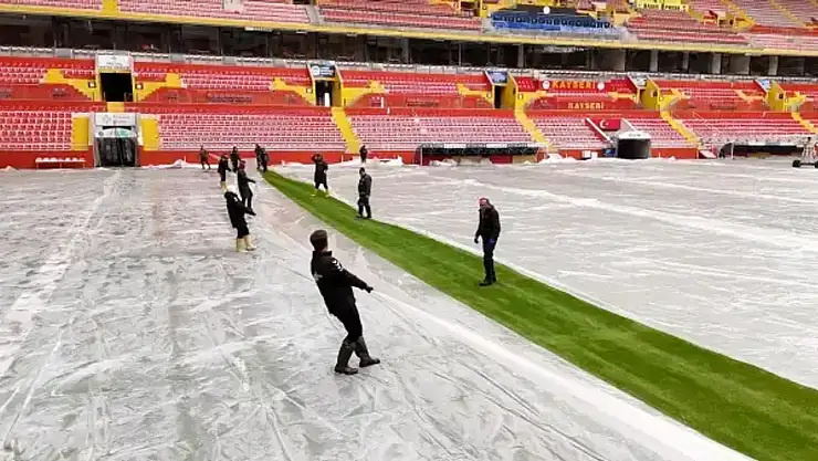 Kayserispor'un maçlarına ev sahipliği yapan RHG Enertürk Enerji Stadyumu'nda, dondurucu soğuklara karşı zemin özel naylon örtü ve yapay güneşleme sistemiyle koruma altına alındı.