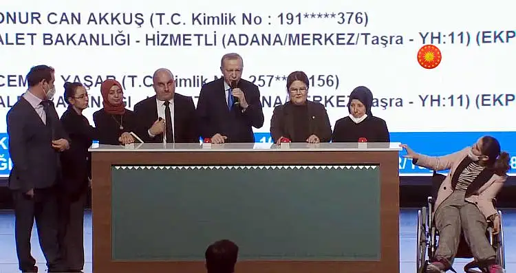 Daha sonra Aile ve Sosyal Hizmetler Bakanı Derya Yanık ile engellilerle birlikte ataması yapılacak 2 bin 927 engelli için butona basıldı. İşlerinin ve görev yerlerinin hayırlı olmasını dileyen Erdoğan, "Kamudaki engelli memur sayımız bugünkü atamyla birlikte 66 bine ulaşmış oluyor. Hükümete geldiğimizde kamuda sadece 5 bin 777 engelli memur vardı. Biz yaptığımız 63 bin atama ile engelli kardeşlerimizin hayata katılmalarına, topluma faydalı işler üreten kişiler olmalarını sağladık" dedi.