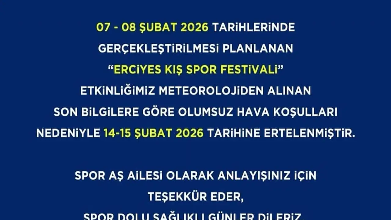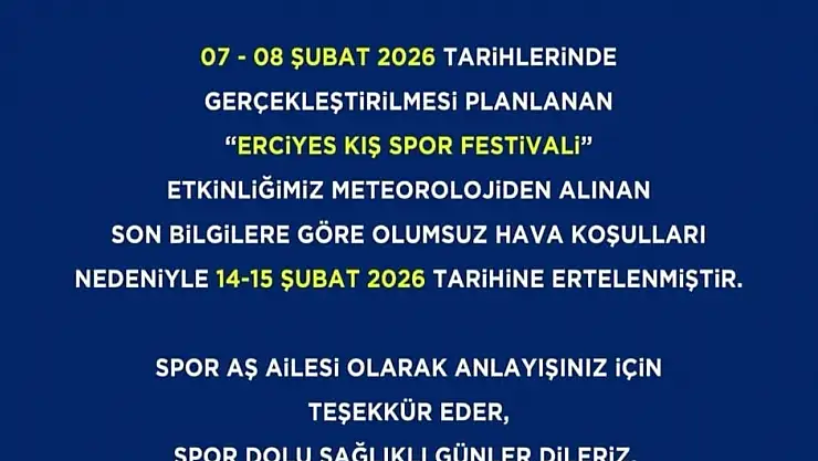 Açıklamada ayrıca, Erciyes Kış Spor Festivali’nin 14-15 Şubat 2026 tarihlerinde yapılmasının planlandığı bildirildi. Festivalin yeni tarihinde, kış sporları ve çeşitli etkinliklerle ziyaretçilere keyifli anlar yaşatması hedefleniyor.