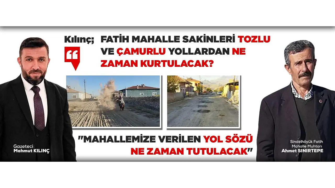 Sindelhöyük Fatih mahallesinin 2022'de yapılacağı söylenen tozlu ve çamurlu yollarının 2022 yılının sonuna gelinmesine rağmen hâlâ yapılmamasının ardından verilen sözlerin tutulması için Sindelhöyük Fatih mahallesi Muhtarı Ahmet Sınırtepe ve Gazeteci Mahmut Kılınç yetkililere seslendi.