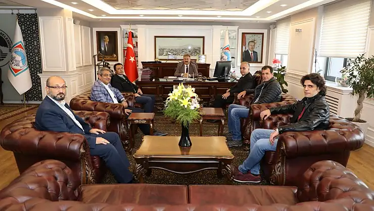 Harita ve Kadastro Mühendisleri Odası Kayseri Temsilcisi Taylan Öztürk ve yönetimi Melikgazi Belediye Başkanı Dr.Mustafa Palancıoğlu'nu makamında ziyaret ederek, görüş alış verişinde bulundular.