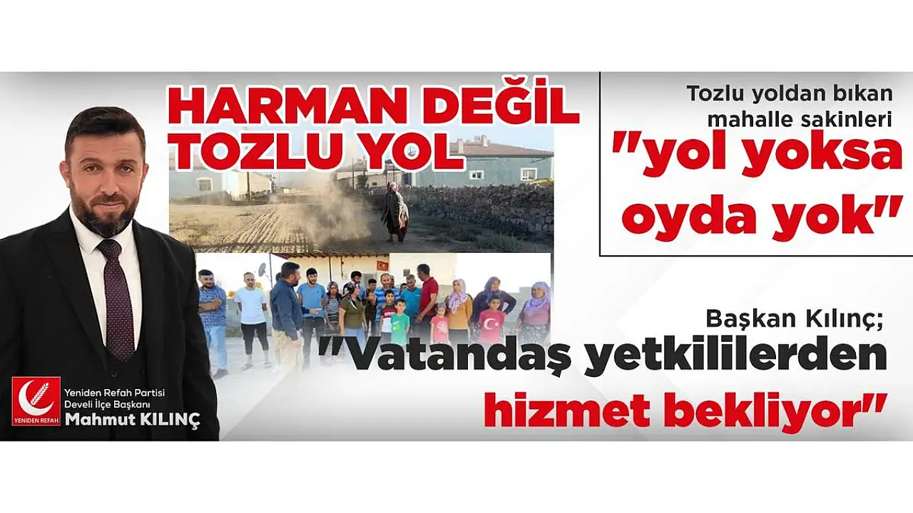 Yeniden Refah Partisi Develi İlçe Başkanı Mahmut Kılınç açıklamasında; "Vatandaşı dinledik, yıllardır bu yolların yapılmasını bekliyorlar, bizde geçen dillendirmiştik. Bu insanlar yıllardır hizmet bekliyor, yazın tozdan kışın çamurdan bıkmış durumdalar. Hasta çocuklar hasta vatandaşlar var burada.
