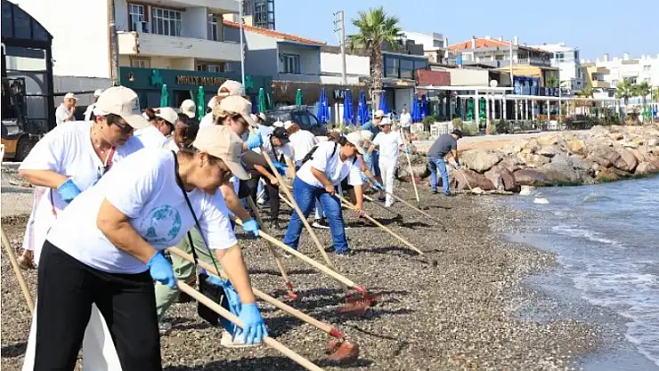 İzmir'de Güzelbahçe Belediyesi, tüm Güzelbahçe sahili boyunca tüm personel ve halkla birlikte sahil temizliği yaptı.