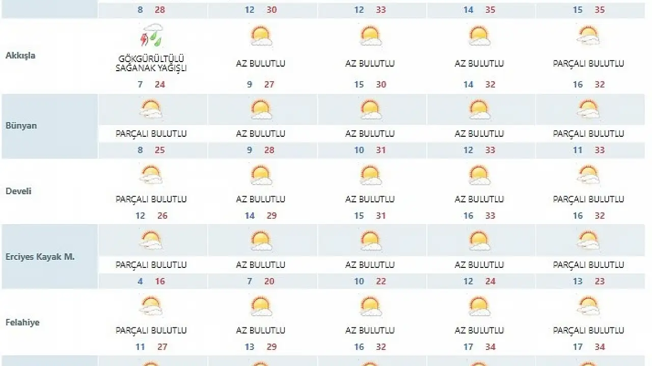 Meteoroloji 7. Bölge Müdürlüğü, Kayseri ve ilçeleri için 29 Ağustos-1 Eylül 2023 tarihlerini kapsayan hafta içi hava tahmin raporunu açıkladı. Son değerlendirmelere göre kent genelinde parçalı bulutlu hava hakim olacakken yer yer yağış görülecek. Sıcaklıklar ise ilçelerde düşecekken kent genelinde en düşük 28 derece olacak.