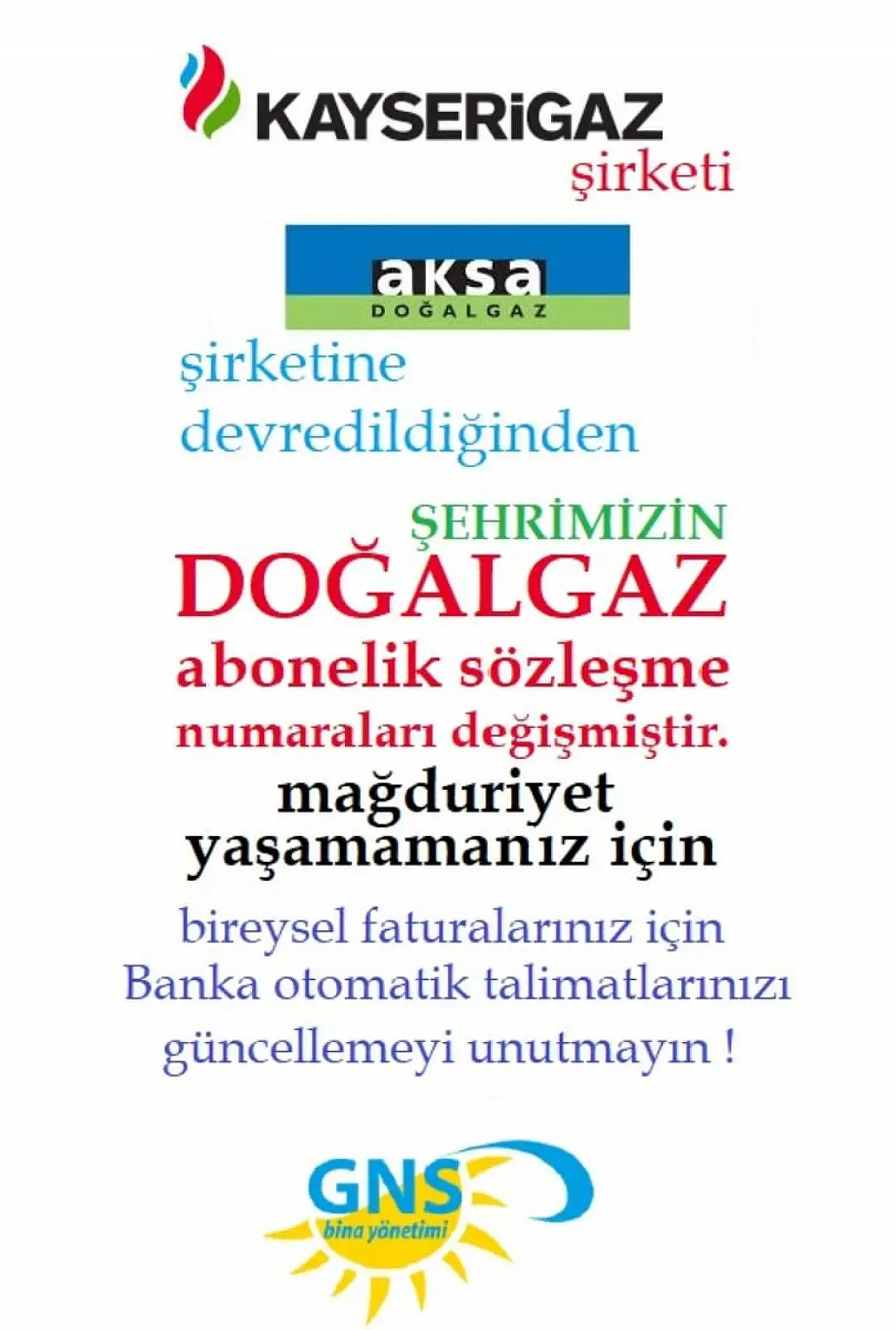 Aksa Doğalgaz'dan devralınan Kayseri doğalgaz aboneliklerinde sözleşme numaraları değişti fatura ve otomatik ödeme talimatları güncellenmeli.