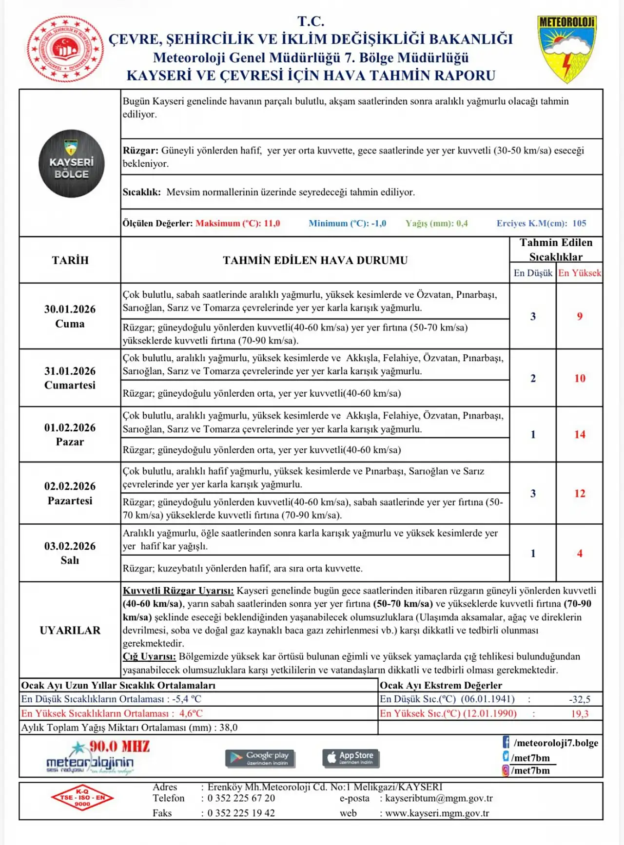 30 Ocak Cuma günü havanın çok bulutlu, sabah saatlerinde aralıklı yağmurlu, yüksek kesimler ile Özvatan, Pınarbaşı, Sarıoğlan, Sarız ve Tomarza çevrelerinde yer yer karla karışık yağmurlu olacağı öngörülüyor. Günün en düşük sıcaklığının 3, en yüksek sıcaklığının 9 derece olması bekleniyor.