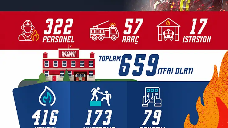 Kayseri Büyükşehir Belediyesi İtfaiye Daire Başkanlığı, Ocak ayında 659 olaya müdahale ederek halkın güvenliği için büyük bir çaba gösterdi. 17 istasyon, 57 araç ve 322 personel ile her türlü acil durumda hızlı ve etkin şekilde görev yapan ekipler, yangından trafik kazalarına, doğal afetlerden kurtarma operasyonlarına kadar geniş bir yelpazede hizmet sundu.