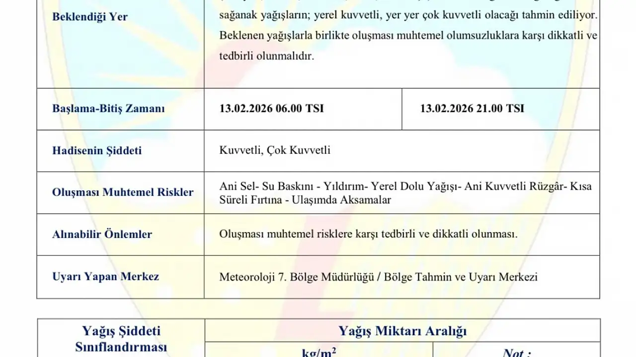 Yetkililer, riskli durumlarda özellikle dere yatakları ve su taşkını ihtimali olan bölgelerden uzak durulması gerektiğini belirtti.