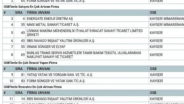 OSB'lerde 2023 yılında ilk 100 arasına Kayseri'den giren firmalar belirlendi.Buna göre şu başlıklarda ilk sıraları, 2023'de en çok satış yapan, en çok ihracat yapan, en çok istihdam yapan, en çok kadın istihdamı sağlayan ve en çok arge harcamasını artıran
