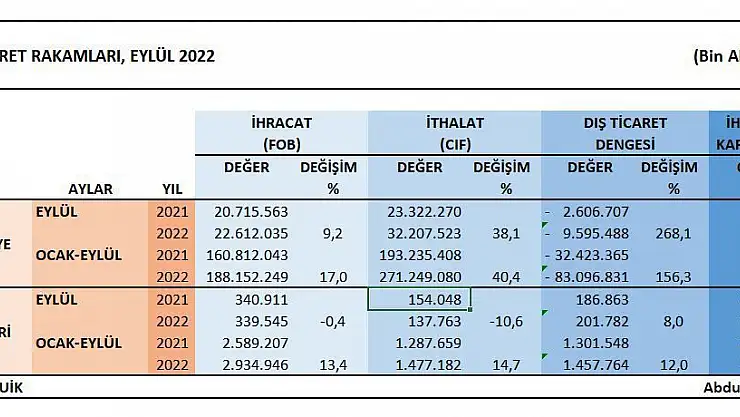 TÜİK, 2022 yılı Ocak ve Eylül ayı dönemi ihracat ve ithalat rakamlarını açıkladı. Buna göre Kayseri’nin geçen yılın aynı dönemine göre ihracatı yüzde 13,4 artışla 2 milyar 935 milyon olurken, ithalatı ise yüzde 14,7 artışla 1 milyar 477 milyon oldu.