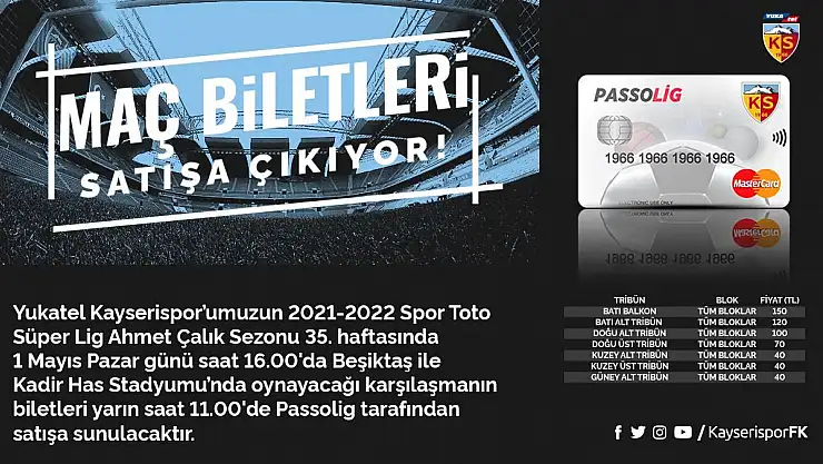 Sarı kırmızılı kulüpten yapılan açıklamada, “Yukatel Kayserisporumuzun 2021-2022 Spor Toto Süper Lig Ahmet Çalık Sezonu 35. haftasında 1 Mayıs Pazar günü saat 16.00'da Beşiktaş ile Kadir Has Stadyumu’nda oynayacağı karşılaşmanın biletleri saat 11.00'de Passolig tarafından satışa sunulacaktır” ifadelerine yer verildi.