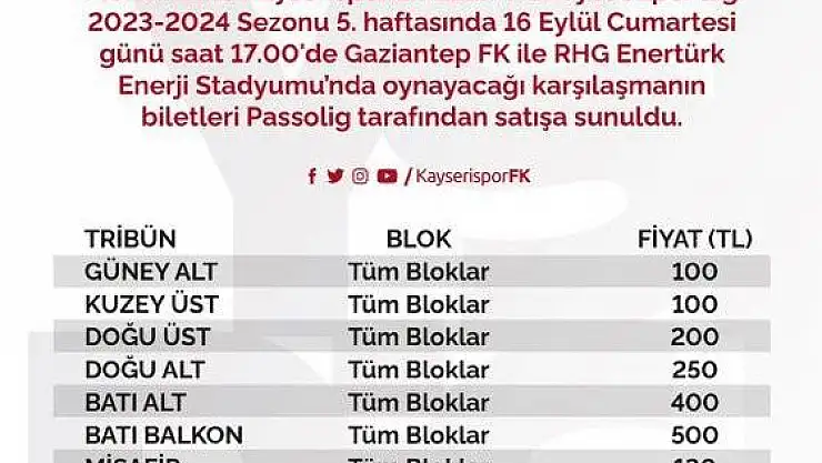 Kayserispor Süper Ligin 5’nci haftasında Gaziantep FK’yı konuk edecek. Bu müsabakanın biletleri satışa çıktı. Kulüpten yapılan açıklamada, "Kayserispor’umuzun Trendyol Süper Lig 2023-2024 Sezonu 5. haftasında 16 Eylül Cumartesi günü saat 17.00'de Gaziantep FK ile RHG Enertürk Enerji Stadyumu’nda oynayacağı karşılaşmanın biletleri Passolig tarafından satışa sunuldu" ifadelerine yer verildi.