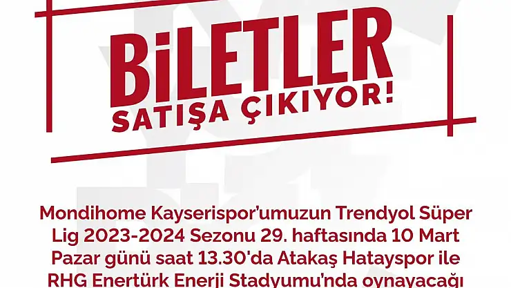Kayserispor tarafından Pazar günü oynanacak olan Hatayspor maçının biletleri yarın satışa çıkacak. Kulüp tarafından, “Haydi maça Kayseri, Kayserispor’umuzun Süper Lig 2023-2024 Sezonu 29. haftasında 10 Mart Pazar günü saat 13.30'da Hatayspor ile RHG Enertürk Enerji Stadyumu’nda oynayacağı karşılaşmanın biletleri yarın saat 11.00'de Passolig tarafından satışa sunulacak” açıklamasında bulunuldu.
