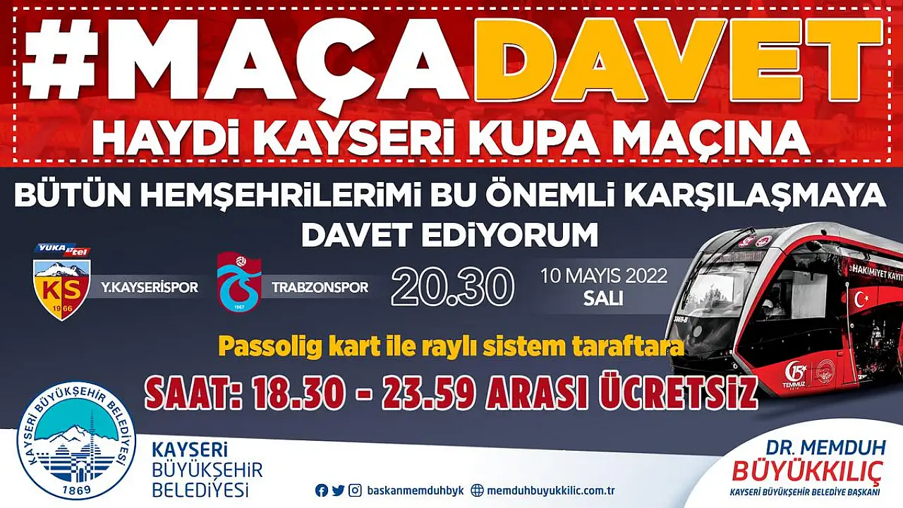 Ziraat Türkiye Kupası Yarı Final ikinci maçında rakibi Trabzonspor ile karşı karşıya gelecek olan Yukatel Kayserispor’a destek çıkan Büyükşehir Belediye Başkanı Dr. Memduh Büyükkılıç, 10 Mayıs Salı günü Kadir Has Stadyumu’nda saat 20.30’da başlayacak karşılaşma için taraftarın ulaşımının ücretsiz olması talimatını verdi. Karşılaşma günü belirlenen saatlerde tramvaylarda passolig kartı olan taraftarlar için ulaşım ücretsiz olacak.